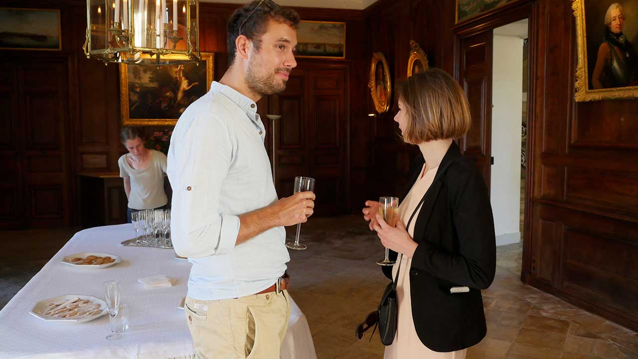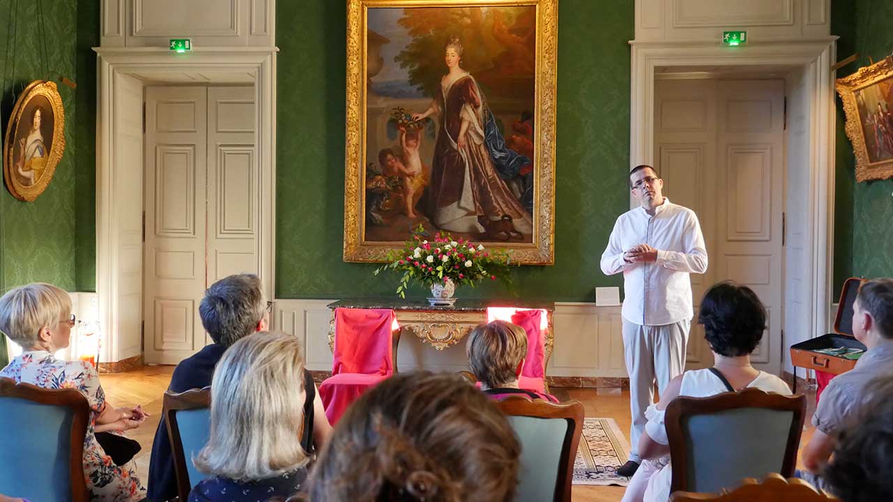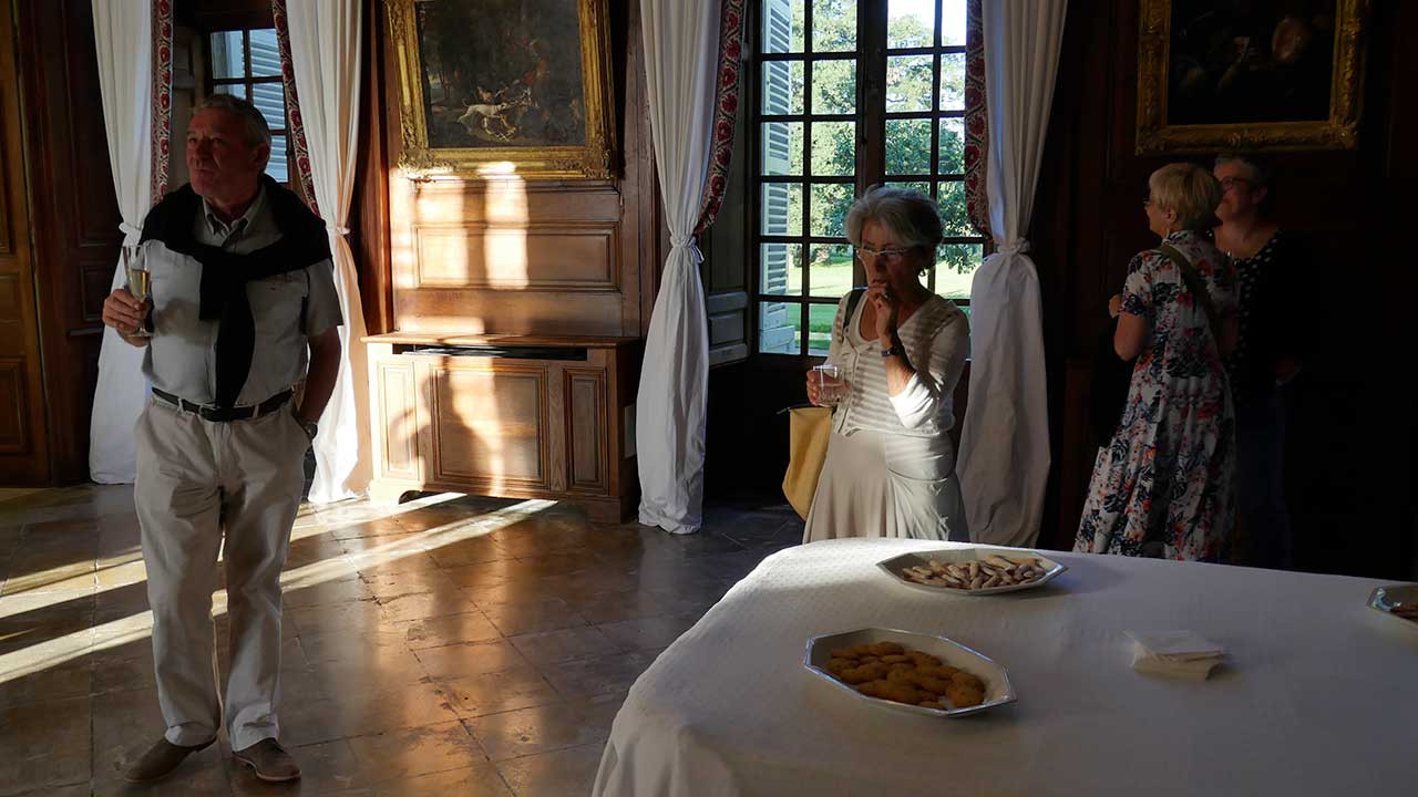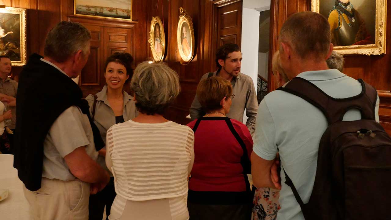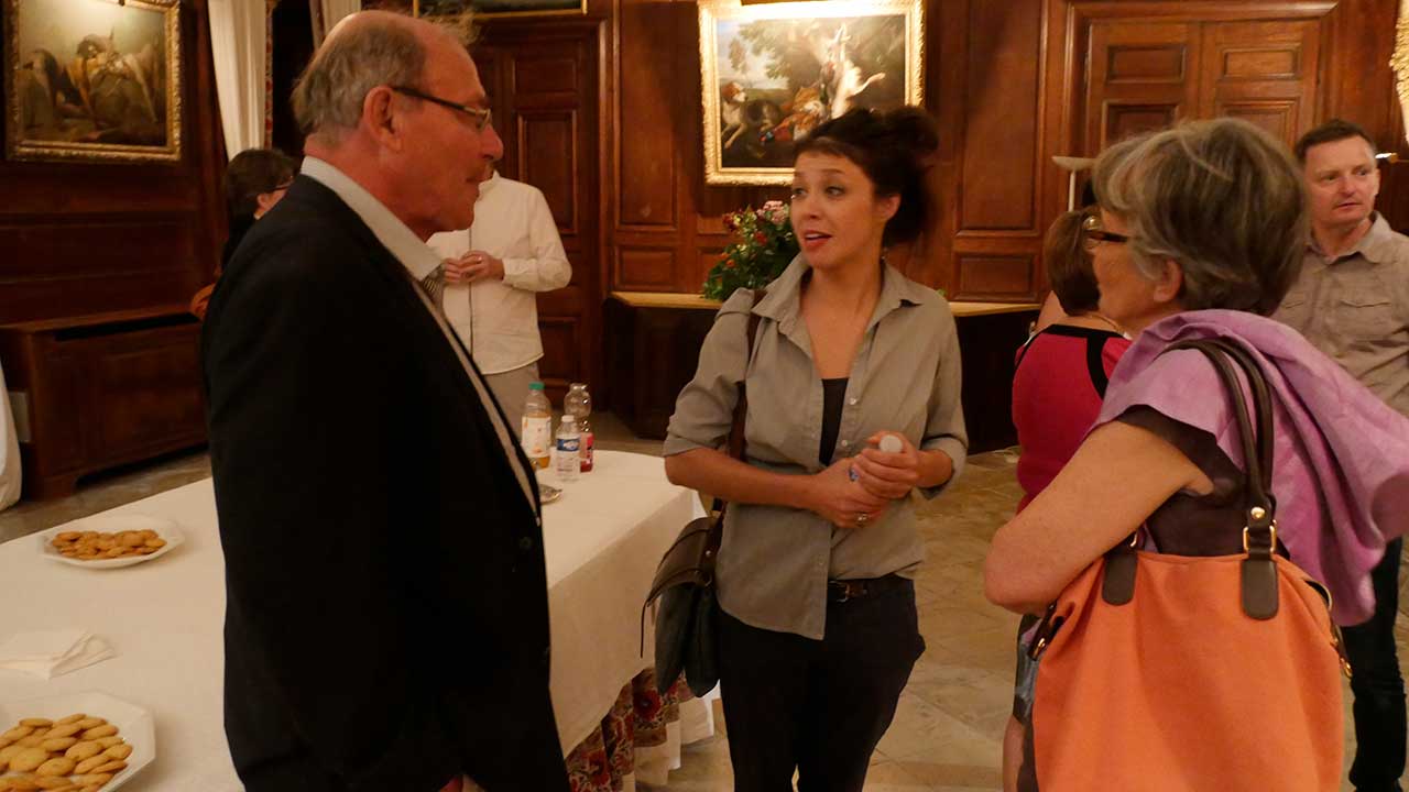 Les spectateurs ont été accueillis dans la grande salle à manger par l’auteur et le metteur en scène de la pièce, Philippe Bulinge avec qui ils ont pu échanger autour d’une coupe de champagne. Ils ont ensuite pu rejoindre le grand salon vert à l’étage pour la représentation qui a duré environ 1h15. Toute la troupe et les visiteurs se sont retrouvés ensuite dans la salle à manger autour d’un jus de fruit pour échanger avec les comédiens.