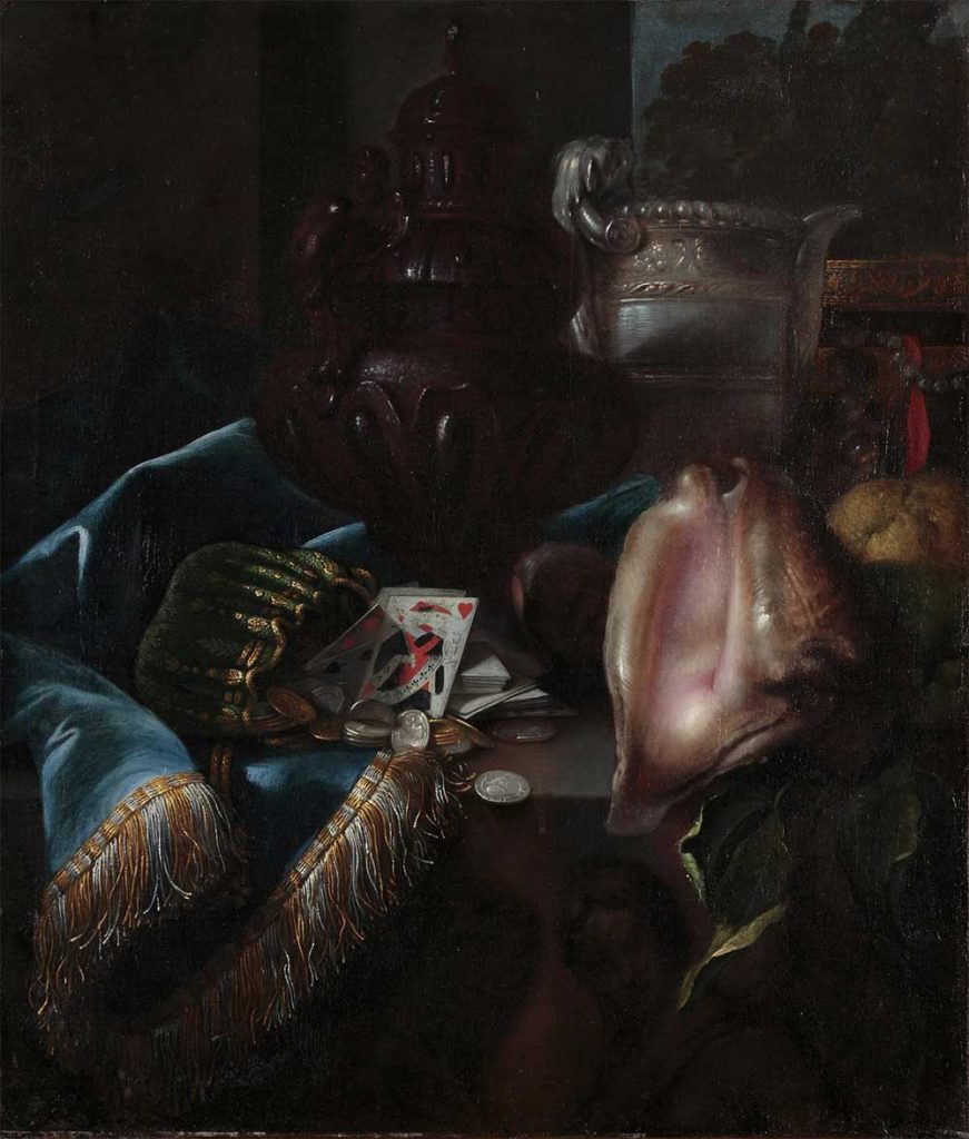 Nature morte d’orfèvrerie, coquillages et jeu de cartes